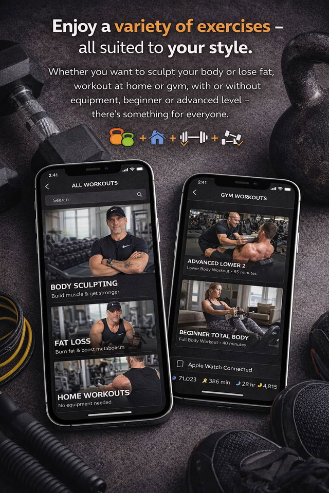 Workout Programs (Home & Gym): Follow structured training programs based on your fitness level. Clear exercise guidance so you always know what to do. Designed to build strength, burn fat, and improve consistency.