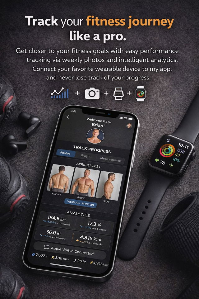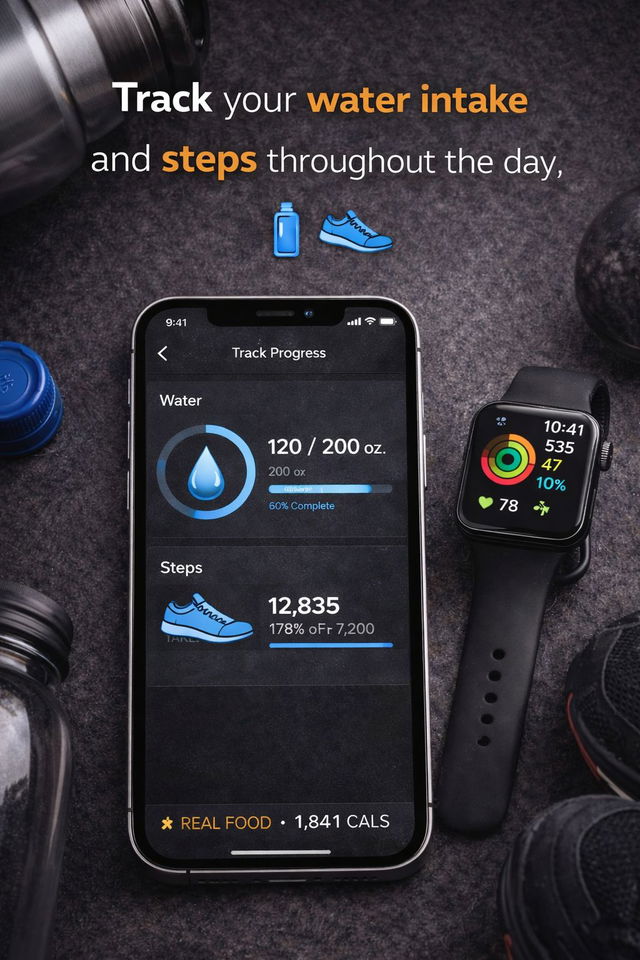 Progress Tracking: Log weight, measurements, and progress photos. Track habits like workouts, steps, and hydration. See trends over time so you stay focused and motivated.