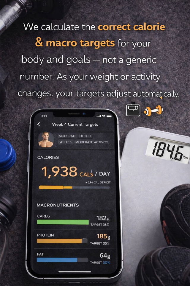 Calorie & Macro Tracking: Track calories, protein, carbs, and fats with ease. Clear daily targets so you know exactly what to hit. Designed to support fat loss, muscle gain, or maintenance.